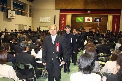生徒会長の木下君が、新入生代表の原田君に生徒会旗を手渡しました。