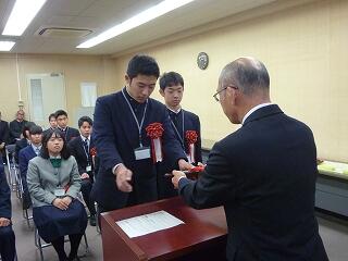 本校は全国水産・海洋高等学校生徒研究発表大会で優秀賞を受賞した、3Cの黒木君、宮元君、溝口君の3人が宮崎県産業教育振興会 小池光一会長より、賞状と盾をいただきました。