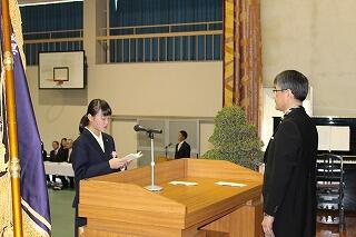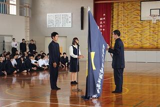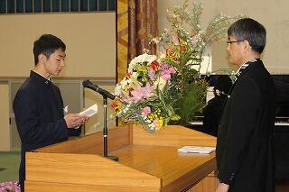 金丸生徒会長から生徒会旗を手渡され、新入生代表の挨拶をした春口君。