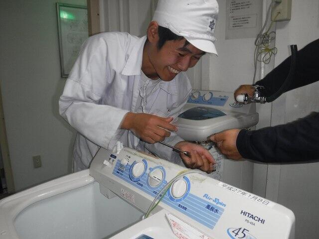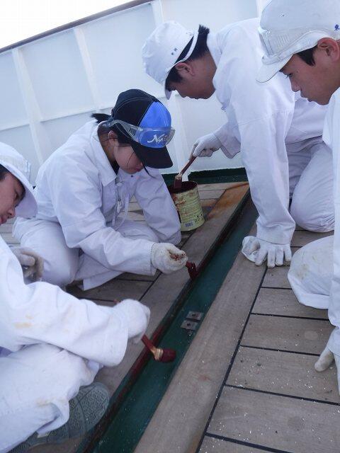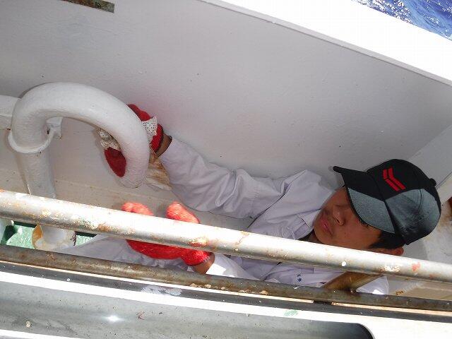 機関室でも当直の実習生が機関整備作業に取り組んでいます。