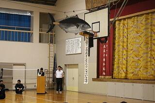 体育館の端から端を泳いでくす玉に到着した「まぐろ君」です。