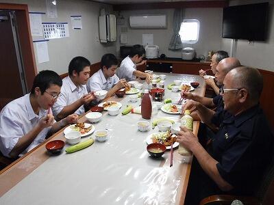 励んでいます。実習生は船酔いを克服し食欲旺盛です。