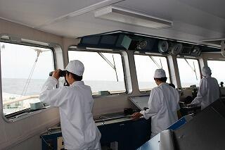 ブリッジ当直の様子です。針路上に危険な船・漂流物がないか見張りをしています。
