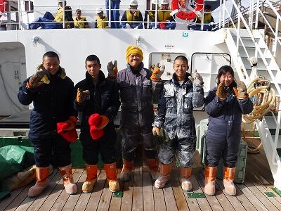昨夜は大風大波の中で最後の揚げ縄を早めに終え、締めくくりの記念撮影