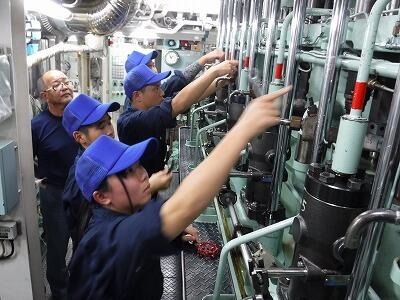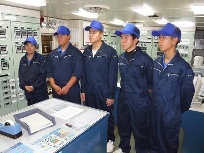エンジン当直の様子です。船を動かす機関部について、船員の方から教わっています。