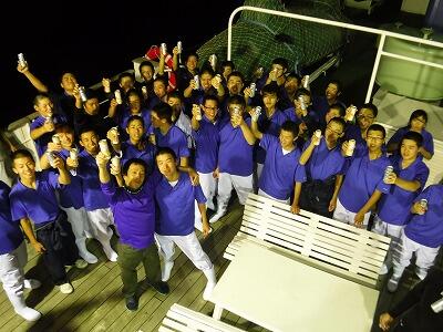 と小慰労会(福引き有)を行いました。中部大平洋の荒波を無事に乗り越えた実習生が良い表情で写っています。