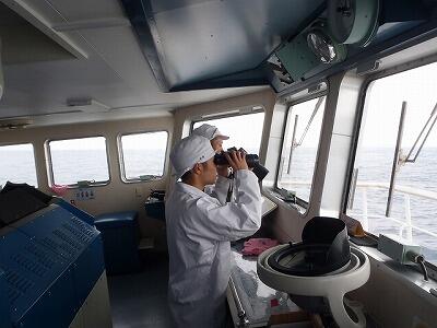 操舵室(ブリッチ)による見張り当直中です。