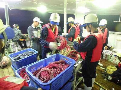 操業中に使用する釣りもとワイヤーを作成中です。