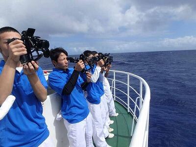 日本の最東端に接近、絶海の孤島の風景に実習生は感慨深げでした。今日も順調に父島に向かっています。
