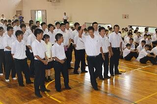 1学期終業式に先だって表彰式が行われました。高校総体等の各種大会で入賞した空手道部、ヨット部、陸上部、ソフトテニス部が全校生徒の前で賞状や優勝旗を授与されました。