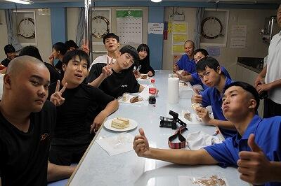 本船オリジナル企画、実習生とのサロンでディナー会を実施中です。