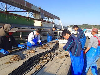 2Aのインターンシップの様子です。牡蠣の垂下作業実習,定置網に入った魚の出荷作業やカンパチの消毒や魚体測定,船体の手入れなどの実習を体験しました。他にもダイビングショップ,うなぎの加工場での実習を行いました。