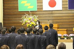 卒業生代表の横山君からの答辞では「2年次に行われた長期乗船実習で、慣れない船内生活のストレスや激しい船酔いの度に挫けそうになり、身も心も崩れかけていた。その時、友達の「一緒に頑張ろう」の声が大きな励みとなり、僕も苦しんでいる友達を助けようと前向きになれた。そのような互いに切磋琢磨できる仲間に出会えたことは一生の宝物です。」と語ってくれました。