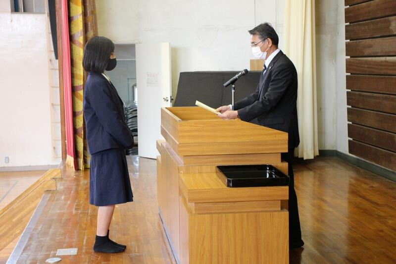 在校性代表の堀内さんから「社会全体のマナーやルールなどが大きく変化し、学校生活での振る舞い方にも戸惑うことがたくさんありましたが、新しい生活様式での様々な取り組みの中で、先輩方はお手本となって私たち在校生を導いてくれました。」と送辞が述べられました。