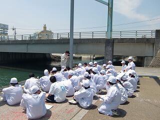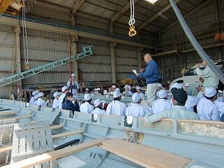 次に艇庫へ移動して、カッター訓練についての説明を受けました。「カッター思ったより大きいなぁ。自分も漕げるかなぁ。」