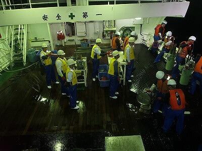 北方の強烈な低気圧から大きなうねりが届く為、大きくピッチング(縦揺れ)する中での作業です。