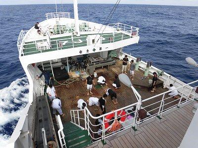 お世話になった進洋丸を生徒、指導教官、乗組員みんなで綺麗に磨き上げます。