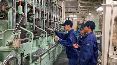 機関当直実習の教材は本物の「実機」。 操業実習の片付けも実習生が主体で行います。