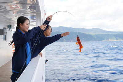 八丈島近くでは、釣り実習。