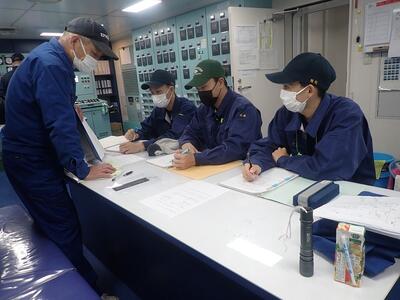 油津港にて進洋丸に燃料油の積み込みが行われました。実習生は乗組員の指導のもと、燃料油タンクの測深やスカッパープラグの取付けを行い、燃料油積み込みの手順や注意事項を学ぶことができました。