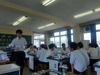 漁業系の授業では海図を使って現在地を知る方法を勉強しました。本校3年生の生徒たちが丁寧に指導していました。