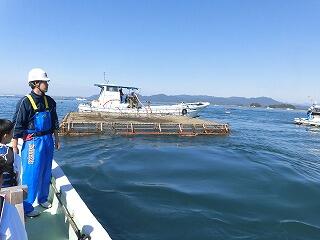 その後、船で沖合まで出て、実際に養殖いけすを見せていただきました。