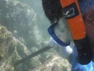 見つけたウニを、棒でつぶします。うまく割ることができました。