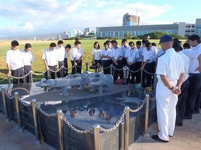 実習生は朝一番、カカアコ公園にて『えひめ丸慰霊碑』を訪問。献花、黙祷を捧げ