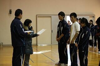 表彰式では,2学期に顕著に活躍した部活動(ヨット部・空手道部・ソフトテニス部)などが表彰されました。