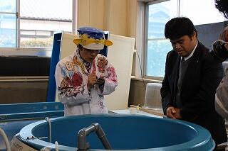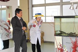 講演後に本校玄関で飼育している「シロチョウザメ」を感激して見ておられました。養魚棟も見学されましたが、職員の話を熱心に聞いてメモをとられる姿が印象的でした。