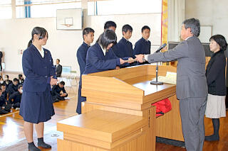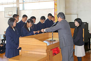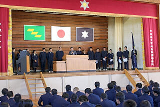 先日の生徒会役員選挙で当選した生徒たちが,旧生徒役員から生徒会旗を引き継ぎました。