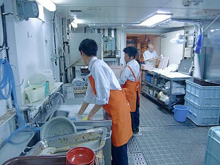 作業班実習生はプロムナードデッキの漁具整備と厨房整理清掃に別れて頑張っています。