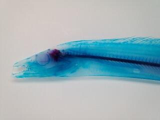 水産科学同好会が11月末より作製を続けてきた太刀魚の透明骨格標本がついに完成しました。