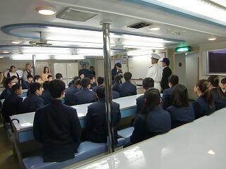 1年B組の出港式は天候がすぐれず、船内で行われました。