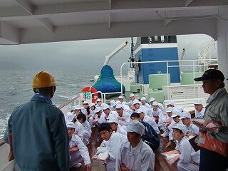 午後からの当直実習では、船酔いにも少し慣れてきたのか、乗組員の先生方のお話にも食い入るように耳を澄ましています。(実際は、エンジン音で先生の話が聞きづらいのです・・・)