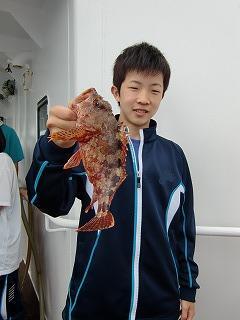 なかなか釣れず、みんなの気持ちも沈みかけた時、”釣れたぞ~!!先生写真写真!!”と声が上がりました。1番目の釣果は”かさご”でした。