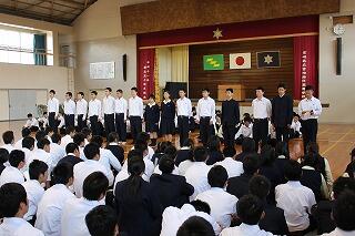 教頭先生より、バスケットボール部主将 中尾君へ 団旗の授与があり、選手代表宣誓をソフトテニス部主将 林君が元気よく行いました。5月30日(土)から始まる、高校総体での皆さんの健闘を祈ります。