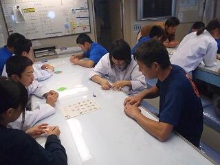 乗組員と実習生全員で、えひめ丸慰霊碑にお供えするための千羽鶴を心込めて一羽一羽織りました。