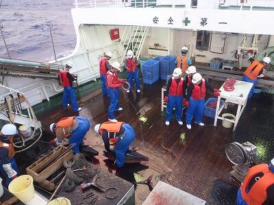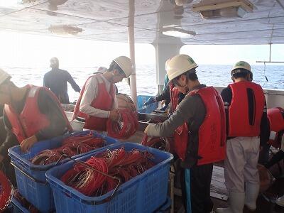 投縄班の一部実習生は船酔いを再発。 辛抱しながら作業に一生懸命取り組んでいます。