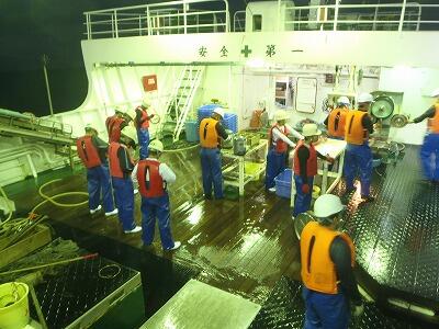 夜の揚げ縄作業。揚げ縄作業は、昼から夜中まであり、生徒は交代に従事します。