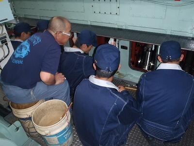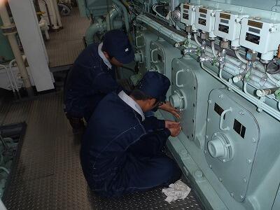 機関長指導の下、主機関の連接棒・クランク軸の点検中!