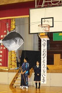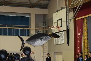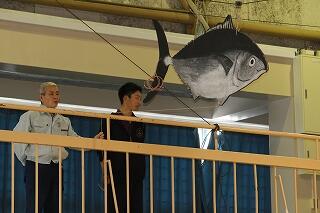 体育館の端から端をまぐろが泳ぎ、くす玉を割るという恒例のイベント・・・失敗する年もありますが・・・