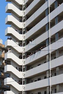 住民の方の許可を頂いて、三カ所の非常階段を利用し、5・6階へ駆け上がりました。ご協力いただき、ありがとうございました。