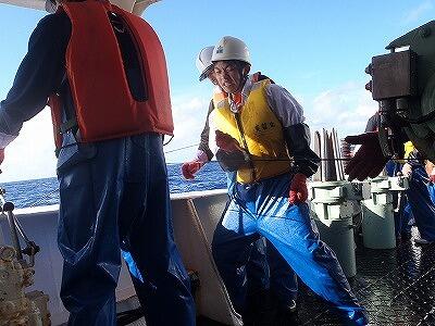 適水明けは前線通過により風向が大きく変わったため、右舷風上となり波しぶきを受けての揚縄作業となってしまいましたが、実習生は波に濡れながらも最後まで元気に作業していました。