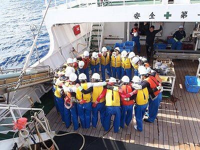 14時20分(船内時)晴天の下、胴の間で円陣を組み、一同気合いを入れ揚縄を開始しました。実習生は皆、どこかしら笑顔です。 総員元気です。