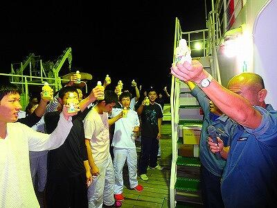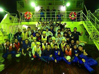 千秋楽!作業終わりに実習生・乗組員・指導教官で記念写真の様子です。