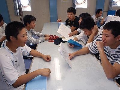 次は、機関長の試験です。 お互いに問題を出し合い勉強中!