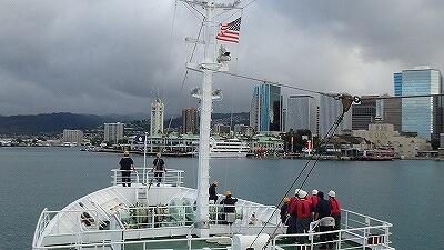 7時50分雨が残るホノルルに入港しました。 ベテランパイロット(水先案内人)の話では入港時の雨模様は歓迎の涙、縁起が良い!ということです。