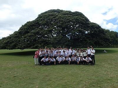 観光でモアナルア・ガーデンズ(日立の木)の前で記念撮影です。