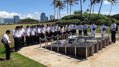 ホノルル寄港二日目は国際交流です。実習生は朝一番からバスに乗り